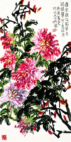 何水法早年由学习两宋绘画入手,练就了扎实的传统基本功,其工笔画结构严谨,用笔圆润自如,设色典雅秀逸,得到诸多画界前辈的赞赏。然而何水法并不满足于此,随后拜一直仰慕的著名画家陆抑非先生为师,日习夜思,得其衣钵。在外人看来已经取得无上殊荣的何水法仍然觉得自己做的不够。深思熟虑后,何水法毅然放弃了传统花鸟画中几乎是必不可少的石头,单纯以枝叶支撑全景式画面,追寻更为纯粹的花鸟画。在构图的繁简方面,何水法也有所变革。传统花鸟画注重“留白”,讲究虚实、透气,画面多简洁静寂。何水法大胆尝试繁密构图,画面繁复热烈。这一变革最初曾受到一些非议,传统画家指责他的画面太满。“其实满有什么不好?这是一种形式,好与不好不在于满与疏,关键是要有神韵。”何水法坚持了自己的变法。他坦露:“其实,这种构图的灵感来自于中国传统山水画--层峦叠嶂,只不过我把那些原本画面中的山石都换成了生机勃勃的花卉,变成了花的海洋。”事实证明,何水法的坚持是对的。他的开拓性变革很快得到了业内的认可与欣赏。在变革传统构图与增删传统绘画元素的基础上,何水法又吸收西画元素进行语言探索,最终突破藩篱,自成一家。何水法这种开拓性创造,不仅奠定了他在中国花鸟画坛难以取代的独特地位,而且对中国画坛其他画科也具有广泛而深刻的启示性作用。