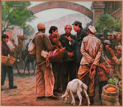 我看了一些历史照片,当时这个市场是非常繁荣的。因此,我在上世纪80年代初期就已经产生了画这幅画的构思。这个题材具有现实意义,它反映出一个事实:党中央在战争年代就重视发展经济,而且当时就计划搞市场,已经有了边区贸易,有了发展经济的雏形。以后邓小平提出改革开放,和延安时期的发展贸易有相通之处,因为不论革命时期还是建设时期,发展经济、改善人民生活都是我党的努力目标。