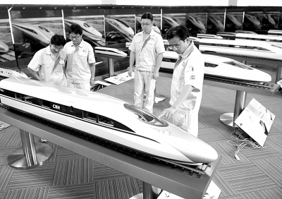 几名设计人员在CHR380A动车模型前(7月4日摄)。 新华社发