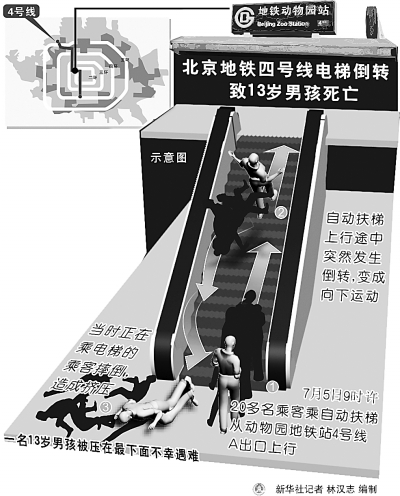 7月5日上午,一场横祸从天而降!北京地铁4号线动物园站A口,上行自动扶梯因设备故障突然倒转,造成一人死亡数十人受伤的惨剧。事发后,北京有关部门宣布,事故的原因是:“固定零件损坏,造成驱动链条脱落,扶梯下滑。”