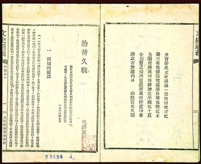 中共领导人著作《论持久战》则伪装为“上海广益书局印行”的铅印线装本“文史通义”,其右上角竖向印有“甲申年重梓”字样。在书名页的左下角,竖向印有“古愚署耑”。书名页的背面,有“山阴旧史氏”的题记。据曾在晋察冀抗日根据地工作的老同志回忆,这种以“文史通义”作题名的伪装本,是在晋察冀抗日根据地印制的,但也有人认为是1944年在敌占区秘密印制的。
