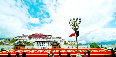 布达拉宫广场上的标语“热烈庆祝西藏和平解放60周年”。拉萨市主城区的街景改造工程已经完成。花坛、标语、国旗把古老的拉萨装扮得格外靓丽,准备迎接西藏和平解放60周年庆祝活动。