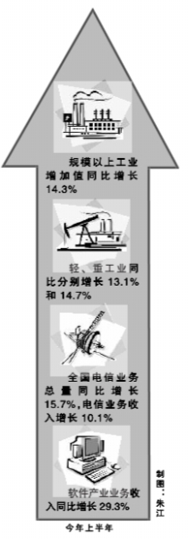 同时,通信业发展平稳,上半年全国电信业务总量同比增长15.7%,电信业务收入同比增长10.1%;软件产业业务收入同比增长29.3%。