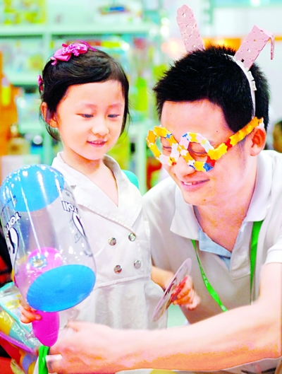 7月30日,一位家长带着孩子参观“玩博会”。当日,第二届中国(北京)国际玩具动漫教育文化博览会在国家会议中心举行。上百家海内外知名玩具品牌带来的拼装遥控、科普教育、亲子互动玩具吸引了众多家长带着孩子前来参观。新华社记者 赵琬微摄