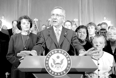 7月30日,在美国首都华盛顿的国会大厦,参议院民主党领袖里德(前)出席关于解决债务上限问题新闻发布会。 新华社/美联社