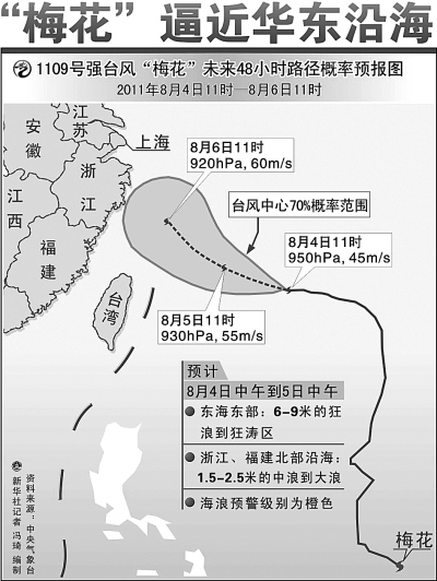 本报北京8月4日电(通讯员袁于飞)中央气象台今日18时发布台风黄色预警:今年第9号强台风“梅花”的中心8月4日17时位于冲绳岛那霸东南方大约190公里的西北太平洋洋面上,就是北纬24.8度,东经128.8度,中心附近最大风力14级(45米/秒),中心最低气压950百帕。预计,“梅花”将以每小时10-15公里的速度向西偏北方向移动,并于5日下午进入东海东南部海域,逐渐向我国华东沿海靠近。
