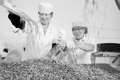 8月6日,内蒙古巴彦淖尔市五原县新公中镇,谱方农民专业合作社的社员正在分拣即将出厂的葵花子,收获的喜悦洋溢在他们的脸上。今年,谱方农民专业合作社的有机无公害葵花子生产量计划突破50万斤,每位社员的年收入将超过2万元。
