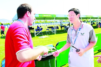 深圳市文体旅游局挂职干部、深圳南山区沙河街道副书记罗弘在大运会射箭场馆为运动员分忧解难。 本报记者 杨慧峰摄