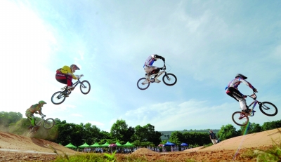 8月14日,获得小轮车比赛冠军的俄罗斯选手叶夫根尼(右二)在比赛中。 新华社记者 李尕摄