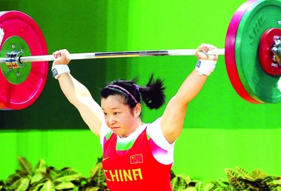 8月14日,中国选手纪静在女子举重53公斤级比赛中。