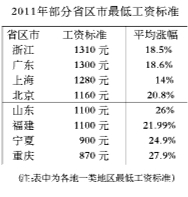 进入“十二五”开局之年,一场提高最低工资标准的“接力赛”在各地展开:北京调高至1160元,上海1280元,广东1300元……“全国最高”标准屡屡易主。上半年,已有18个省区市上调了最低工资标准。劳动是创造财富的源泉,提高最低工资标准是体现“劳有所得”原则、增加普通劳动者收入的重要举措,是深化收入分配制度改革、促进分配公平的重要内容。