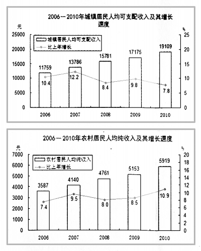 党和政府对此高度重视,相继出台一系列政策措施调整分配关系。如连续7年提高企业退休人员基本养老金水平,年均增长10%;连续8年出台涉农“中央一号文件”,十七届三中全会专题研究“三农”问题,惠农力度不断加大;“十一五”期间,各地平均3.2次提高最低工资标准,每次平均增幅12.9%;加大对低收入群众的帮扶力度,实现最低生活保障制度全覆盖,基本建立城乡社会救助体系;等等。这些措施开始取得积极成效,“十一五”期间,城镇居民人均可支配收入和农村居民人均纯收入年均分别实际增长9.7%和8.9%,2010年农村居民收入涨幅自1998年以来首次超过城市居民。