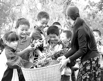 | 培育新农民从娃娃抓起,当地编印了24万册包括社会公德、家庭美德、环保理念等内容的乡土教材,发放到每个学生手中。这是孩子们利用课间在洱海岸边捡垃圾。 |