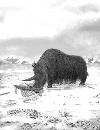 披毛犀:学名Coelodonta  antiquitatis,主要生存于晚更新世,是已绝灭的最著名的冰期动物之一。披毛犀特殊的皮毛可以抵御北极圈的寒冷,所以它在古气候学中扮演了重要的角色,欧亚大陆北部晚更新世的哺乳动物组合通常被称为猛犸象-披毛犀动物群。古生物学家对披毛犀的肉体解剖结构知之甚详,因为有一些冻土地带或沥青沉积中的干尸被发现,也保存了它们像毯子一样覆盖全身的厚重毛发。
