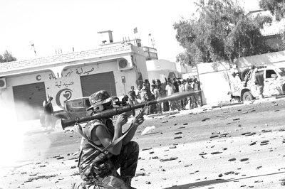 9月24日,在距离卡扎菲老家苏尔特市中心7公里处,利比亚执政当局武装人员向支持卡扎菲的武装发射火箭弹。当日,利比亚执政当局武装人员在北约战机的支援下突然攻入卡扎菲的家乡苏尔特,但在城内遭遇狙击手的激烈抵抗。新华社发