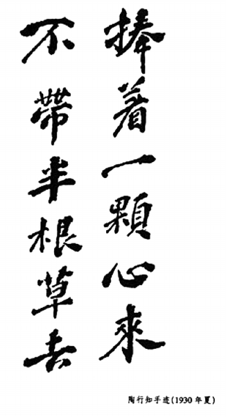 1946年7月16日,陶行知在致育才学校同学会上海分会的信中道:“我们肯为民主死,真民主就会到来。”勉励大家“立志把自己造成一位英勇的民主战士。不但如此,还要做民主的酵母,使凡与我你他接触的人,都发出民主的酵来,成为一个个英勇的民主战士。”这成为他最后的民主遗嘱。