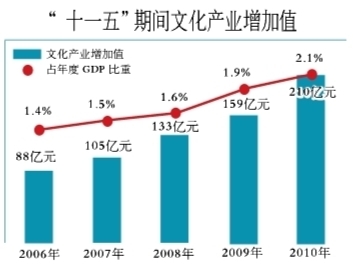 “十一五”期间,黑龙江省文化产业规模不断壮大。文化产业保持较快增长,2010年末,相比“十一五”初的2005年,全省文化产业机构达到6.4万个,增长30.6%;从业人员35万人,增长36.2%;实现增加值210亿元,按可比价格计算,增长1.1倍,年均增长16.4%。