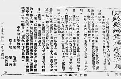 左祥云贪污案。1933年10月,为迎接第二次全国苏维埃代表大会在瑞金召开,中央政府决定兴建中央政府大礼堂、红军烈士纪念塔等“六大建筑”,将建筑施工任务交给二苏大会基建工程所主任左祥云负责组织施工。可是,左祥云却贪污公款(大洋246元),私开路条,并携款潜逃,盗窃军事秘密地图献给白军,甚至企图逃到湖南组织地主民团武装进攻苏维埃。中央工农检查部根据群众举报,组织力量迅速查处了这一要案。1934年2月13日,苏维埃最高法庭举行公审,“判决左祥云处以枪决”,并追究领导责任,对有关领导人分别处以监禁、罚苦役等(《红色中华》第151期)。处决左祥云,一时震动苏区。这是苏维埃中央政府总务厅处级公务员受到法律严惩处以极刑的要案。
