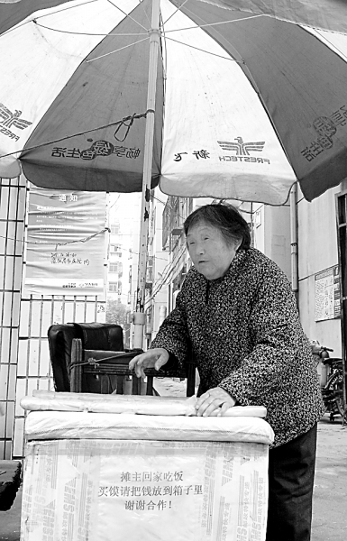11月4日,张景珍在馒头摊前等待顾客。“摊主回家吃饭。买馍请把钱放到箱子里。谢谢合作!买馒头的请留钱。”年过七旬的她卖馒头不用守摊,回家吃饭休息只需把摊子一撂,顾客拿了馒头自然留钱。新华社记者 李安摄
