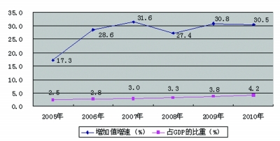 “十一五”期间,福建省文化产业增加值年均增长29.8%,比地区生产总值的年均现价增速高12.2个百分点。文化产业增加值占地区生产总值的比重逐年增加,2010年比2005年提高1.7个百分点(见图1),文化产业呈现快速增长态势。