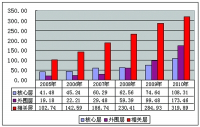 与此同时,从文化产业增加值分层情况看,2010年,福建省以网络文化服务、文化休闲娱乐服务和广告、会展文化服务等为代表的新兴文化服务行业(外围层)发展迅猛,实现增加值达173.46亿元,比2005年增长8.0倍,年均增长55.3%。新兴文化产业的高速增长使该省文化产业结构进一步优化(见图2)。