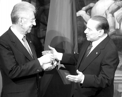 图为11月16日,在意大利罗马总理府举行的交接仪式上,意大利过渡政府总理马里奥·蒙蒂(左)从前总理贝卢斯科尼手中接过象征权力的铃铛。