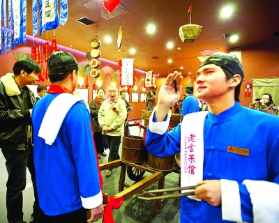 “剃头唻……”12月3日,一声吆喝回响在老舍茶馆二层。当天,老北京传统商业博物馆开馆,并免费对公众开放。老北京传统商业博物馆将各式商业招幌悬挂于博物馆的厅堂上方,厅内陈列展出剃头挑子、水车等近百件商业老物件,供游客零距离地参观体验。