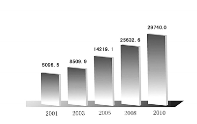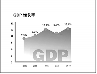 ■10年间,中国国内生产总值从11万亿元人民币增至近40万亿元人民币,年均增长率超过10%。