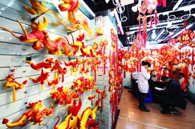 随着新年和农历春节的临近,浙江义乌国际商贸城迎来节前销售旺季,各种新年饰品和龙年吉祥物纷纷亮相,红灯笼、中国结、电子鞭炮等商品深受欢迎,吸引了众多客商前来看样订货。据介绍,每逢岁末年关,义乌小商品市场推出的以生肖为主题的喜庆商品都备受采购商青睐。新华社记者 鞠焕宗摄