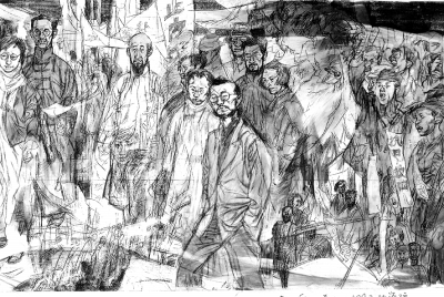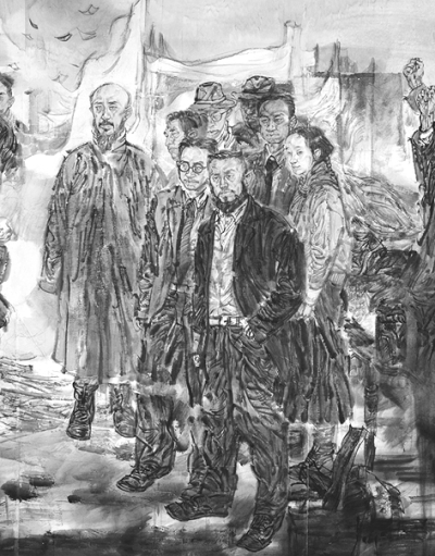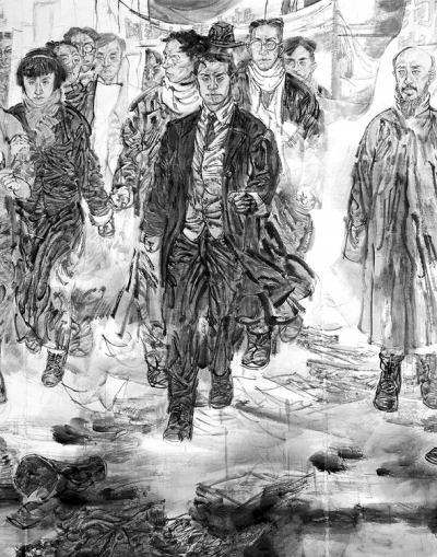 从成稿来看,《一二·九》的笔墨样式整体上较为平实,保留了用笔上的书写性和写意性;同时将线条的密度加大,使画面骨架十分结实,也为之后的加工修改留下创作空间,可以反复积染。