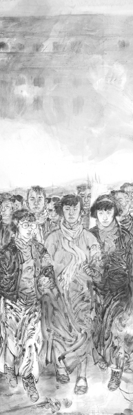 “第三次草图审查过程中,有专家提出画面缺少学生运动的组织性。在这一方面,我画最后的草图时,把人物组合方式做了较大改动——将动态人物集中在画面左侧,中间部分放大了列队游行的学生队伍,突出了学生运动严密的组织性;同时,将前门楼从左侧人物背后移至中央,且放大至足够的尺寸,同时出现大面积的天空;城楼与人物之间的白色烟雾是在作品接近完成时加上的,一是使之成为画面的亮点,二是隐约地传达星火燎原之意,扣合主题;石狮子从原有位置上移20公分,意在加大威慑感,同时平衡了画面的构图。”这样的改动,使作品构图形式产生了根本的变化,由构图产生的崇高感,使画面传达的精神性功能得到很大的开发。