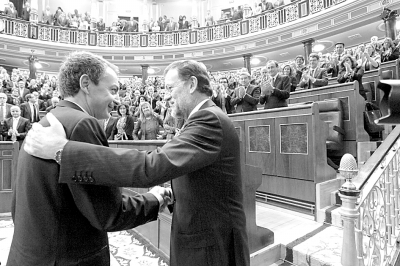 12月20日,西班牙当选首相拉霍伊(右)同现任首相萨帕特罗握手。西班牙议会20日举行投票,选出在此前大选中获胜的人民党领袖拉霍伊为新一届首相。新华社发