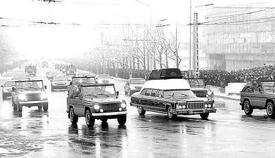 28日的平壤天降大雪。下午2时整,在军乐队低沉的哀乐声中,覆盖着朝鲜劳动党党旗的灵车从锦绣山纪念宫广场西侧缓缓驶出,灵车前的两辆黑色带队车上,分别安放着金正日的巨幅画像及花圈,花圈的黑色缎带上写着“金正恩”。金正恩在灵车右前侧手扶车辆,与朝鲜人民军总参谋长李英浩、朝鲜人民武力部部长金永春、朝鲜国防委员会副委员长张成泽等在灵车旁步行护送。