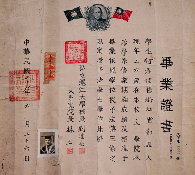 图录:私立沪江大学毕业证书,民国二十六年(1937年),纸本。证书上端正中设孙中山图像,左右两旁为中华民国国旗、国民党党旗。此件系文学院政治学系学生何孝礼修业期满、成绩及格、准予毕业并授予学士学位之毕业证书。证书右侧下角为证书编号“大字第45593号”及验印日期“中华民国廿六年八月叁日验讫”。正中上方钤正方形朱文“上海私立沪江大学钤记”,署私立沪江大学校长刘湛恩,钤朱文“刘湛恩印”,文学院院长林立,钤正方形朱文“林立图记”。偏左侧上方贴国民政府印花税票三枚;下方贴何孝礼毕业照,打盖“私立沪江大学”钢戳;左侧为毕业日期,钤正方形朱文“教育部印”。