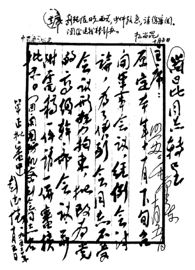 10月5日,彭德怀写信给毛泽东,并附关于召开全国军事系统党的高级干部会议一事给各大单位的电报通知稿。信的全文是:“尚昆同志转呈。主席:原定本年11月下旬召开军事会议,经例会讨论,为使到会同志不受会议形式拘束,拟改为党的高级干部会议。另附电稿一件,请一并审核批示(因关国防机密,到会同志名单正拟审中)。”毛泽东于当日阅彭德怀信及电报通知稿后,即批语:“照办。”