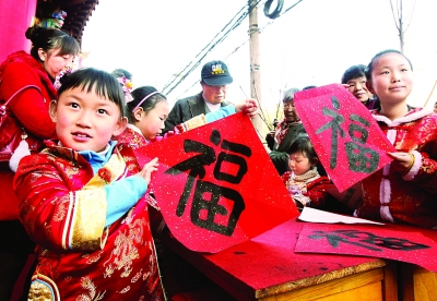 2012年1月2日,第二届百童迎春书“福”送福活动在云南昆明圣爱中医院举行,一百余名各年龄儿童穿着中国传统唐装礼服,现场挥毫泼墨书写迎春“福”字,在弘扬中国传统文化的氛围中,抒发寄托对新年到来的祝福。据悉,一年一度的春城百童书“福”迎春展示活动吸引着越来越多的孩子前来参与,成为昆明元旦迎春文化的一项特色活动。