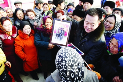 新年之际,新疆摄影家协会的艺术家们来到新疆阿克苏地区库车县齐满镇给农民照全家福。几分钟的时间,农民就看到了自己一家人的照片。图为工作人员正在给农民发放全家福照片。