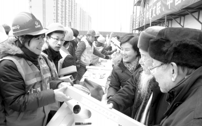 日前,在北京房山区长阳4号地保障性住房建筑工地,侯一民、杜滋龄、吴长江、王明明、刘健等几十位画家冒着寒风,为农民工题写春联、张贴福字,并在自己的印制作品上亲笔签名。能和著名画家们面对面交流,并拿到他们的正版印刷品和题写的春联,工人们非常开心,他们说要将这一幅幅好画和一声声祝福带给父老乡亲。同时,中国美协还现场向农民工赠送精美的画册、美术书籍,表达美术家的新春祝福和问候。图为艺术家们在向工人赠送附有画家亲笔签名的“年画”。