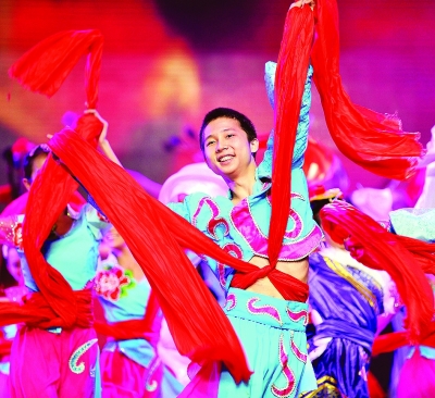 1月5日,第十届中国民间文艺“山花奖”颁奖盛典在海口市举行,这是中国民间文艺的一次集体展示,是“山花奖”创办以来规模最大的一次盛典。图为演员在表演舞蹈《舞动山花》。 新华社记者 郭程摄