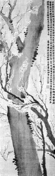 梅兰芳先生的拿手好戏有两出,《贵妃醉酒》和《宇宙风》,每每搬演,光照四座。而金农先生的拿手好戏是他的梅花和漆书。金农的梅花,能松能紧,圈圈点点全是诗歌和文人的白日梦!金农画梅,不是一枝一枝长起,也不是一朵一朵开起,是一长就是一大片,淡墨浓点,真是风雅至极,是浩荡的春风手段。春风要花木从冬天里醒来,原不在摇一枝拂一朵慢慢下工夫,而是铺天盖地!站在金农的大幅梅花下,真是让人一时不可捉摸,不知此老是从何处下手,百杆千枝千朵万朵的感觉分明让人觉得你已身在梅林。金农的漆书是书法史上的开宗立派,是金农方方面面最亮的一面,好得不用再说。