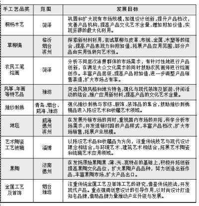作为传统手工艺大省山东省高度重视发展农村文化产业,目前,全省手工艺行业共有企业4300余家,从业人员近200万人,2009年总产值突破千亿元,居全国同行业第二位。其中,农村手工文化产业带动150万农村人口就业,创造了显著的经济和社会效益。