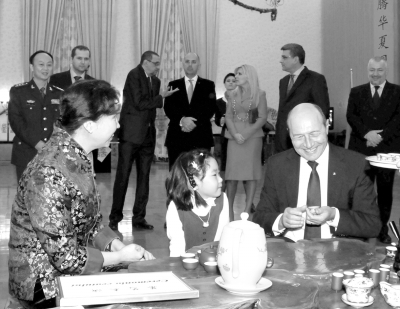 1月10日,在布加勒斯特的中国驻罗马尼亚大使馆,罗马尼亚总统伯塞斯库高兴地品茶,并对中国茶文化表现出浓厚的兴趣。当晚,罗马尼亚总统伯塞斯库携外交部长巴孔斯基、旅游部长乌德雷亚、文化部长凯莱门等官员前来中国大使馆,与使馆工作人员共迎新春。
