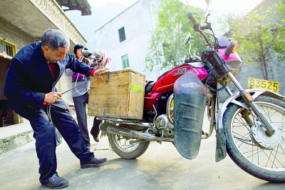 杨永兴在妻子的帮助下,把放映机搬上摩托车。