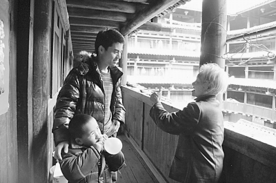 沿着木制扶梯而上,土楼仍住着不少人家,洗衣做菜,充满着生活气息。在三层的拐角处,记者见到了一位满头银发的老奶奶。一打听才知道,老奶奶也姓简,今年87岁了。两个女儿嫁到了邻村,本想把老人接到养老院,但简奶奶舍不得祖祖辈辈生活的土楼,常年独居在此。“我喜欢住在土楼,这里人多热闹,互相也有个照应。政府对我很好,每个月还给我100元补助。”简奶奶边说边竖起了大拇指。