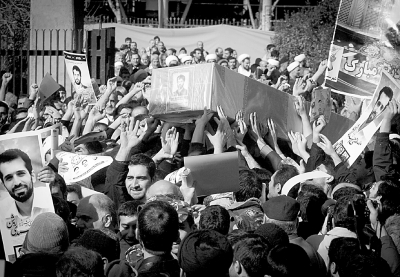 1月13日,在伊朗首都德黑兰,人们为遇害核专家穆斯塔法·艾哈迈迪——罗尚举行葬礼。伊朗核专家穆斯塔法·艾哈迈迪-罗尚11日在德黑兰北部卡塔比广场附近遇袭身亡。