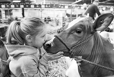 1月12日,在美国宾夕法尼亚州首府哈里斯堡市举行的农场秀上,一名名叫格雷西的女孩亲吻她喂养的奶牛。一年一度的宾夕法尼亚州哈里斯堡农场秀是美国大型室内农业展,至今已经举办了96届。今年的农场秀荟萃了6000多头家畜和290多个与农产品相关的农业展摊,包含了千余项农业趣味竞赛,吸引了全美各地40万观众参观,展示了美国丰富多样的农业特色和传统的农业畜牧业文化。