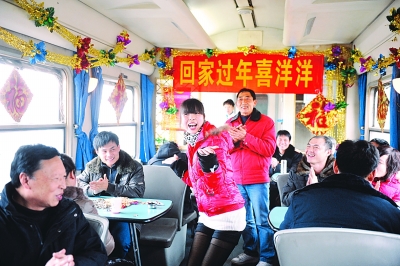 “办个小型联欢会吧,把大家聚过来热闹热闹。”列车长王更生的建议很快得到了大家的支持。于是,拉花、贴福字、挂灯笼。不一会儿,一场以“回家过年喜洋洋”为主题的“联欢会”便在餐厅拉开架势。