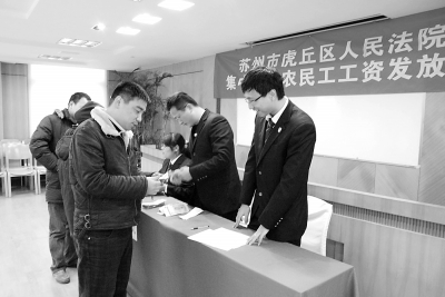 近日,江苏省苏州市虎丘区人民法院探索灵活多样的措施,确保拖欠农民工工资案件快速执行到位。自2011年年底至今20天已为72名农民工执行到工资73万余元。图为2012年1月11日,该院为9名农民工兑付9万余元工资款。 本报通讯员 谈永敏、徐文杰摄