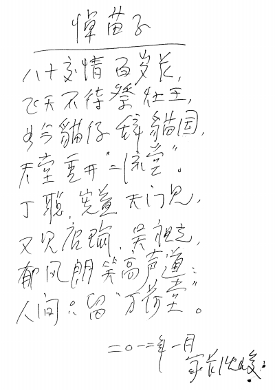 “八十交情百岁长,飞天不待祭灶王,如今猫仔辞猫园,天堂重开‘二流堂’。丁聪宪益天门见,又见唐瑜吴祖光,郁风朗笑高声道:人间只留‘万荷堂’。”这是丁聪夫人沈峻写给黄苗子先生的悼文。她说:“丁聪走时,苗子给丁聪写悼词,现在,我替丁聪悼苗子。我们在一起的时候,大家就是这样乐观。这悼文,苗子会喜欢的。”