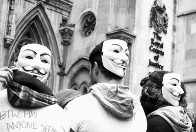 1月18日,头戴抗议面具的示威者聚集在英国首都伦敦的英国高等法院门外。当天,英国高等法院一名法官裁定伦敦证交所门外的示威者营地应被移除。受美国“占领华尔街”示威行动影响,一些英国示威者于2011年10月开始在伦敦证交所门外建起帐篷营地,至今已抗议超过三个月。 新华社发